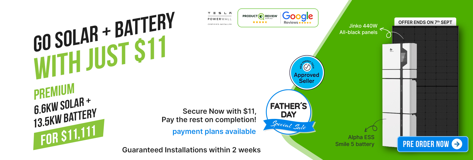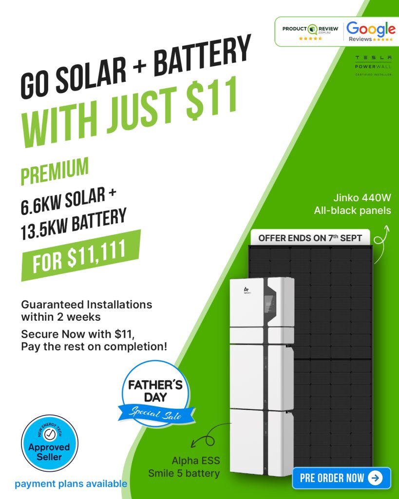 With $11 upfront and the rest on completion, you can enjoy premium Jinko 440 Watt All Black Panels and an Alpha ESS Smile 5 Battery, all installed by our expert team. Plus, flexible payment plans are available to make your switch to solar even easier.